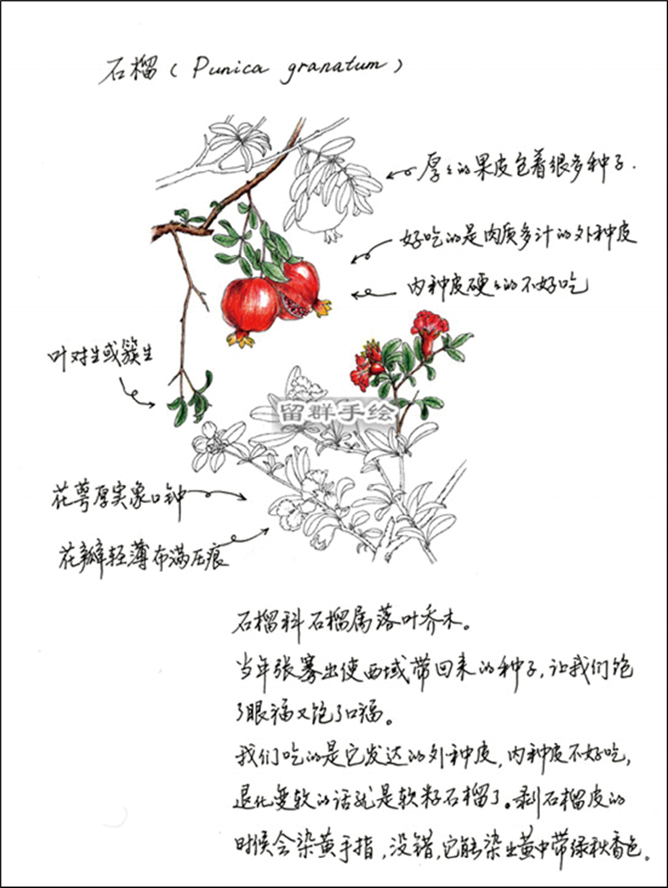 石榴的老家在伊朗那一带,到了中国,因其内部籽粒众多且紧密相连——“千房同膜,千子如一”,被赋予子孙满堂、家族兴旺的美好寓意,格外喜欢。植物志上石榴的正式名曾是安石榴,因为在西晋张华的《博物志》中有记载:“汉张骞出使西域,得涂林安石国榴种以归,故名安石榴。”读来,一时不知道如今的石榴当初是姓安还是复姓安石。起初安石榴被栽植在皇家园林,很珍贵;但到宋朝,易于种植的石榴已很普及,有“安石榴为村客”之说。