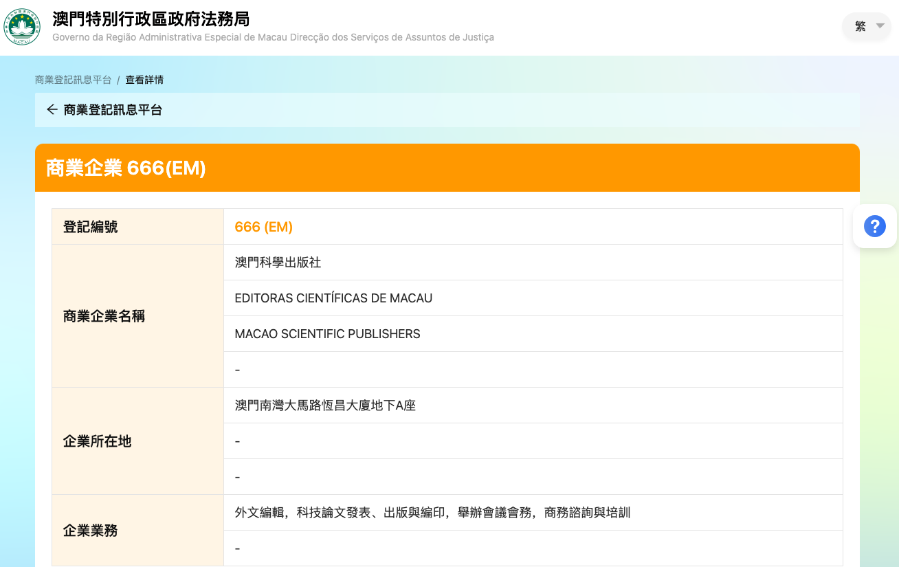 依据澳门特别行政区《商法典》,可在「此处」查询所有商业登记,具体步骤为: